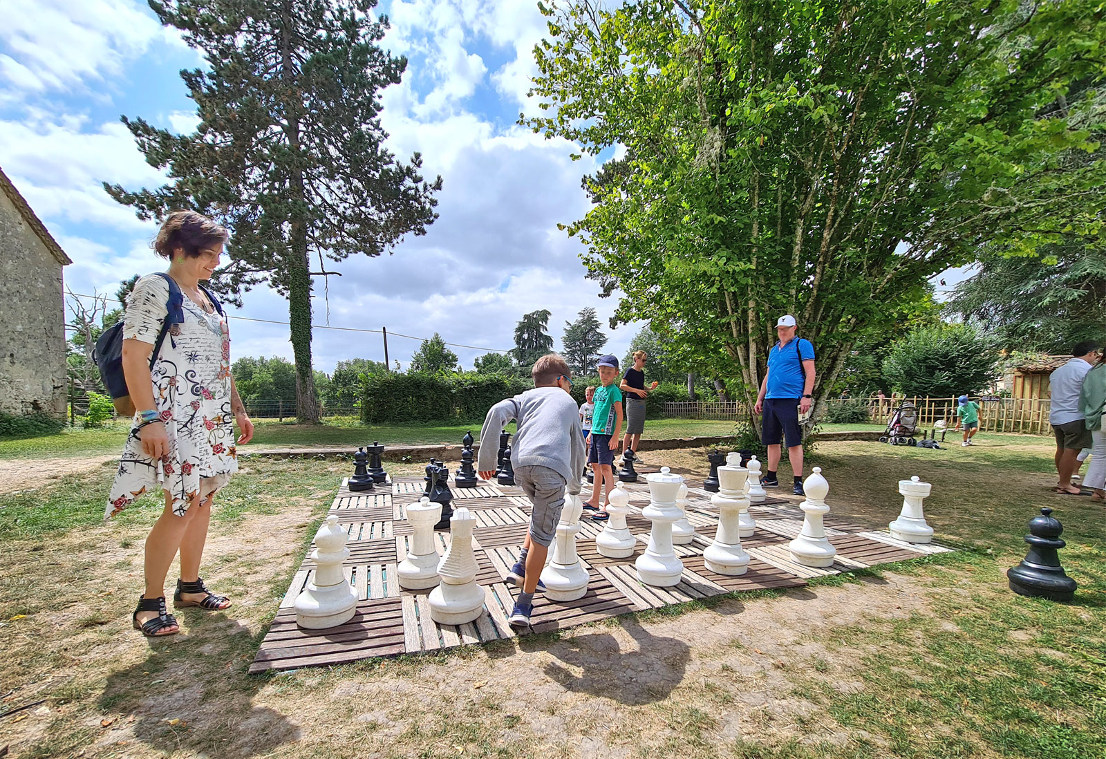 Devant le château se trouve un très joli parc (la plaine des grands jeux) avec des arbres vénérables, qui offrent de paisibles abris à l’ombre où se trouvent des jeux à faire en famille ou des salons d’extérieur pour se reposer. Partout sur la pelouse, des jeux ! Les enfants ne savent plus où donner de la tête. Des divertissements connus ou imaginés dans nos rêves les plus fous, des jeux d’adresse, de puissance, d’équilibre, de ruse, coopératifs, à faire seuls ou à plusieurs. Il y en a pour tous les goûts. Les pôles d’amusement sont tellement nombreux qu’il y a de la place pour tout le monde, même au cœur de l’été. Les jeux sont rapides à faire et on va vite tourner de l’un à l’autre, on ne s’ennuie jamais, même les enfants qui aiment que « ça bouge ».