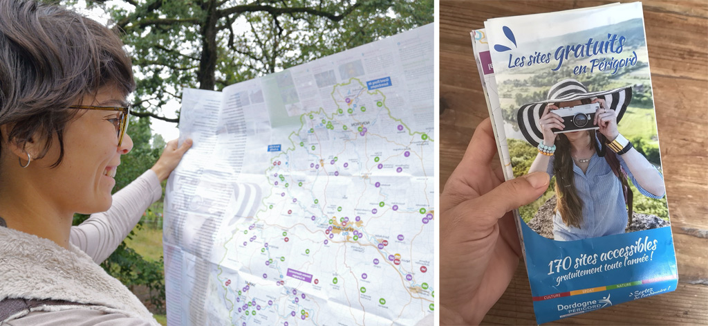 La brochure « Les sites Gratuits en Périgord » est disponible dans les Offices du Tourisme, dans les présentoirs de certains sites touristiques, hébergements et restaurants, mais aussi sur Internet en cliquant ici.