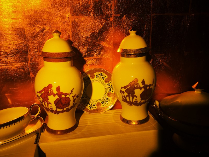 De l’autre côté, de la vaisselle est exposée. Assiettes, bonbonnières et coupelles possèdent des dorures en feuille d’or. L’éclairage jaune-orangé fait ressortir le doré, il me rappelle également l’éclairage des lampes à pétrole que les miniers emmenaient avec eux ! La scénographie est très bien réalisée !