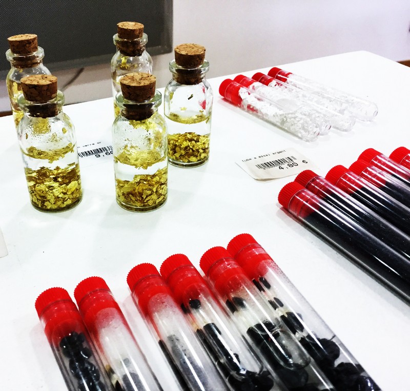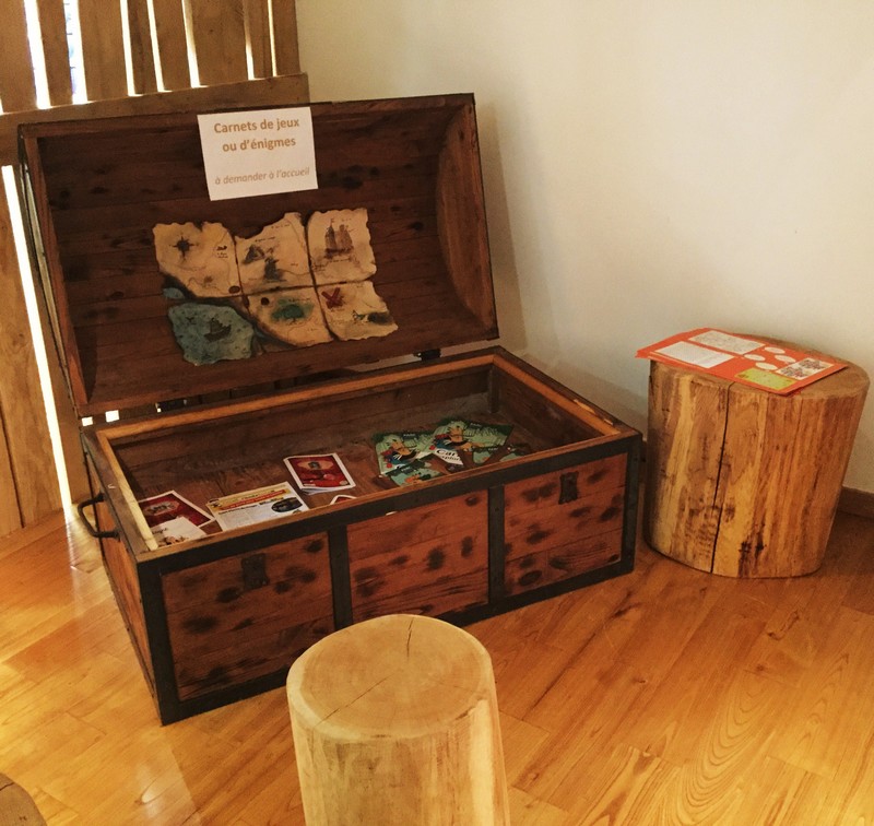 La dernière salle est destinée aux enfants avec un coin coloriage, des rondins de bois servent de table ! L’ultime panneau parle de Saint-Eloi, patron de tous les orfèvres et de l’or à Jumilhac-le-Grand.  Je ressors par la boutique de l’Office après 45 minutes de visite ! Cette boutique propose des bijoux, des feuilles d’or, d’argent et autres minéraux et des produits plus traditionnels comme des couteaux de Nontron estampillés ou des tasses ! L’espace librairie reste sur la thématique aurifère !
