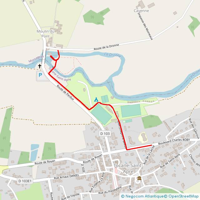 Depuis l’arrêt de bus vous vous dirigerez vers le « Pré Sec », endroit de promenade fréquenté par les habitants de Tocane-Saint-Apre. Une baignade est aménagée au bord de la Dronne, rivière propice à l’installation de nombreux moulins.